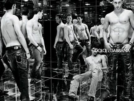 Quando vi os anúncios da última campanha da Dolce & Gabbana, que metem uns rapazes e raparigas mais ou menos bem vestidos dentro de uma sala espelhada, pensei: "olha que fotos tão engraçadas! Adoro o cenário dos espelhos." Pelos vistos, as revistas estão um pouco reticentes com a campanha. É que numa das peças/fotos, um dos rapazes está de peito desnudado, com as mãos nos bolsos e a calça ligeiramente descaída, deixando ver um pouco da sua zona mais farfalotapimpinela. Ora, a revista Esquire não publicou o anúncio na sua forma original, acrescentando-lhe uma pequena folha de adão sobre a zona púbica.