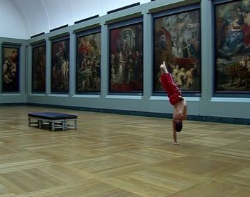 Shahryar Nashat é um artista plástico e propõe uma resposta no seu vídeo "The Regulating Line", onde um rapaz de tronco nu e calças de fato de treino observa os corpos robustos pintados nas telas.